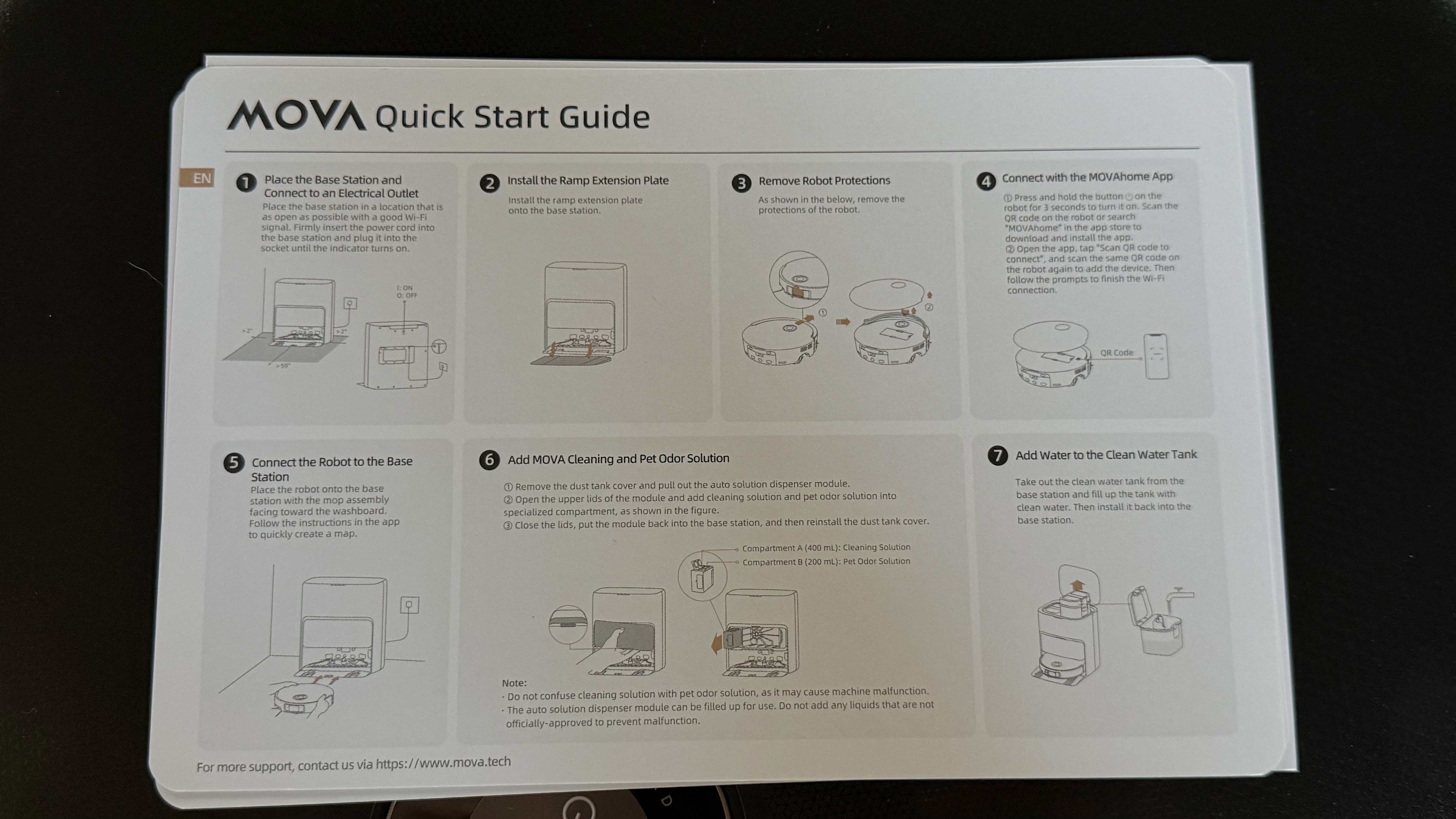 From unboxing to starting my first mapping run only took 15 minutes! I love when vendors provide a Quick Start Guide - specifically designed for impatient people like myself. I always just want to get my new toy up and running, and Mova has made that easy. (I dig into the details later 😉) Following the steps was easy, the app was easy to add, and connecting the Mova was a snap! I filled the water compartment and solution tank with the provided solution. I love that the solution is held separately, allowing the unit to dispense the proper amount of solution for the cleaning task. My Roborock required me to add solution to the water directly, and I was never sure that the solution strength was correct due to the strange proportion ratio in their directions in the solution bottle. Since this unit had a 37% charge out of the box, I ran the mapping run right away! I am looking forward to seeing what 28,000 PAs are capable of in cleaning performance! TranslateView Original Text