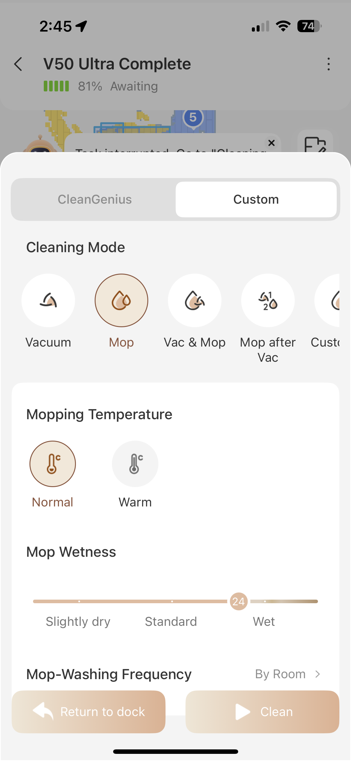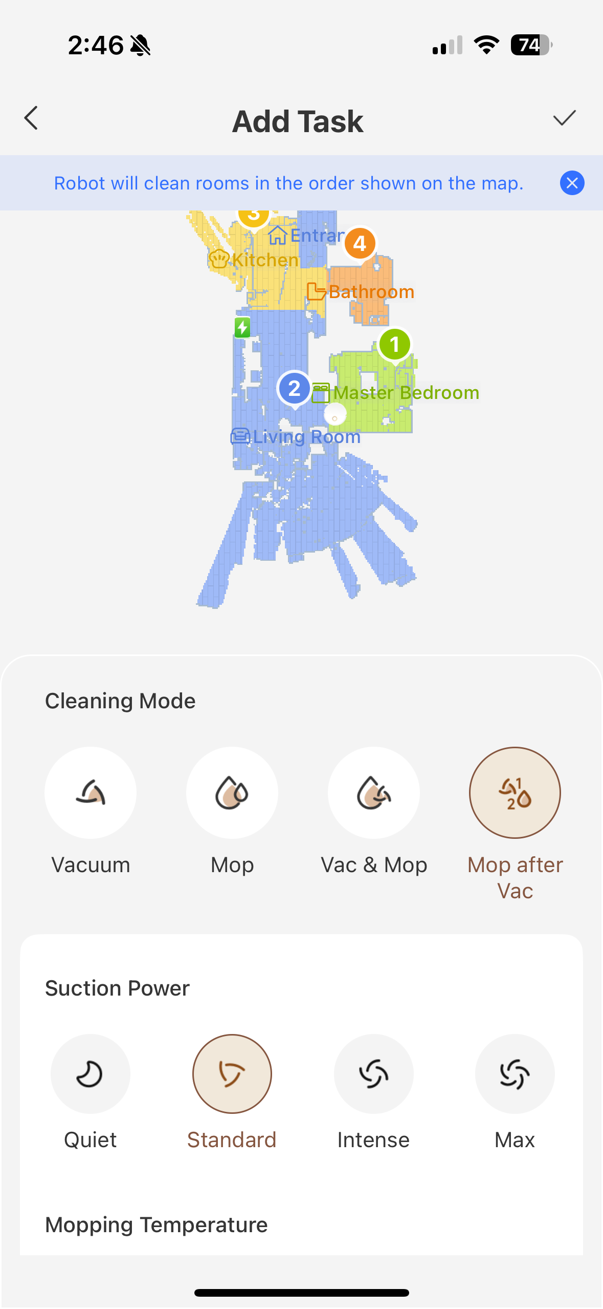 Please try the following methods to see if the problem persists: Delete the current scheduled task and then recreate the "vacuum first, then mop" task.