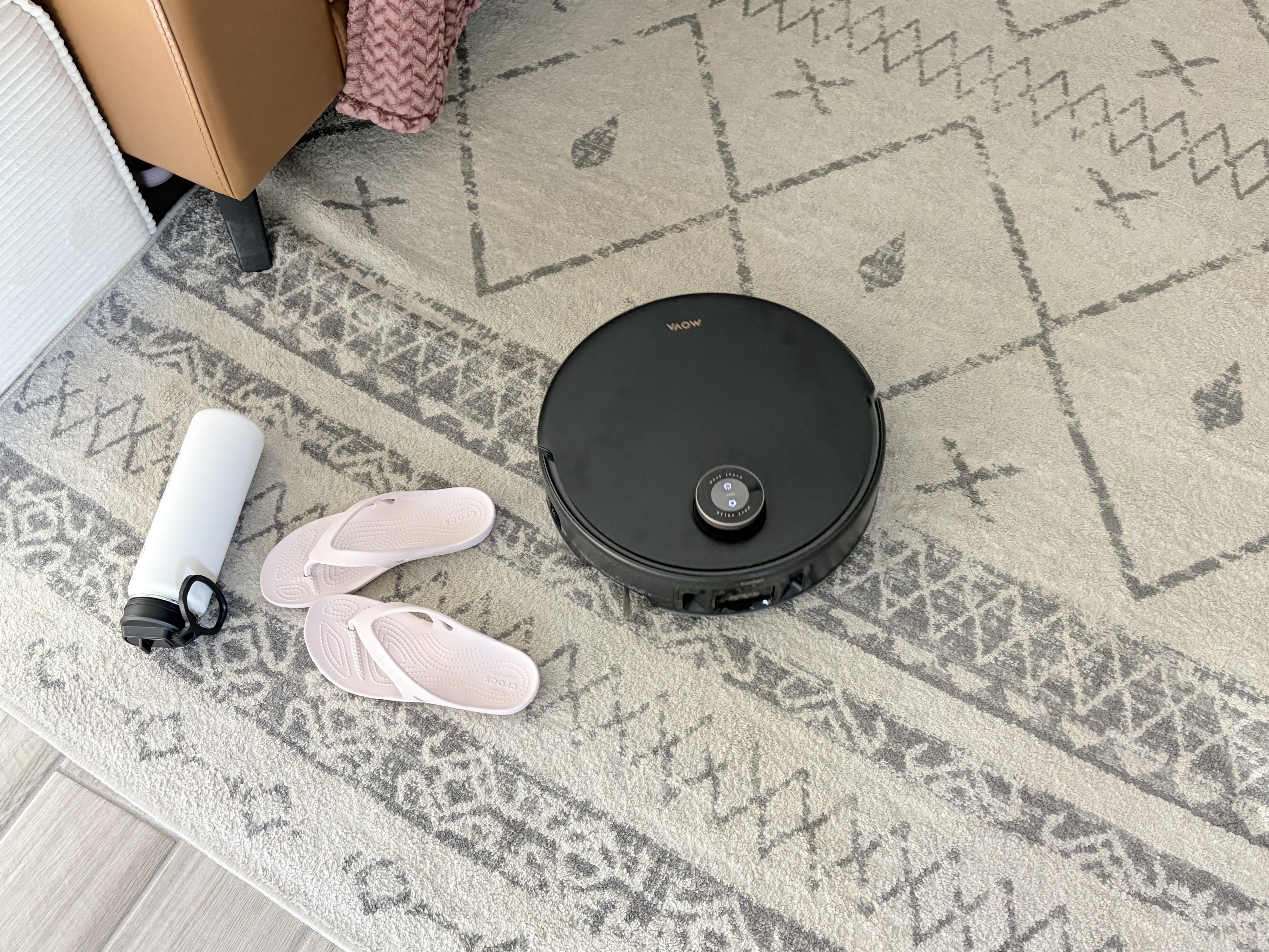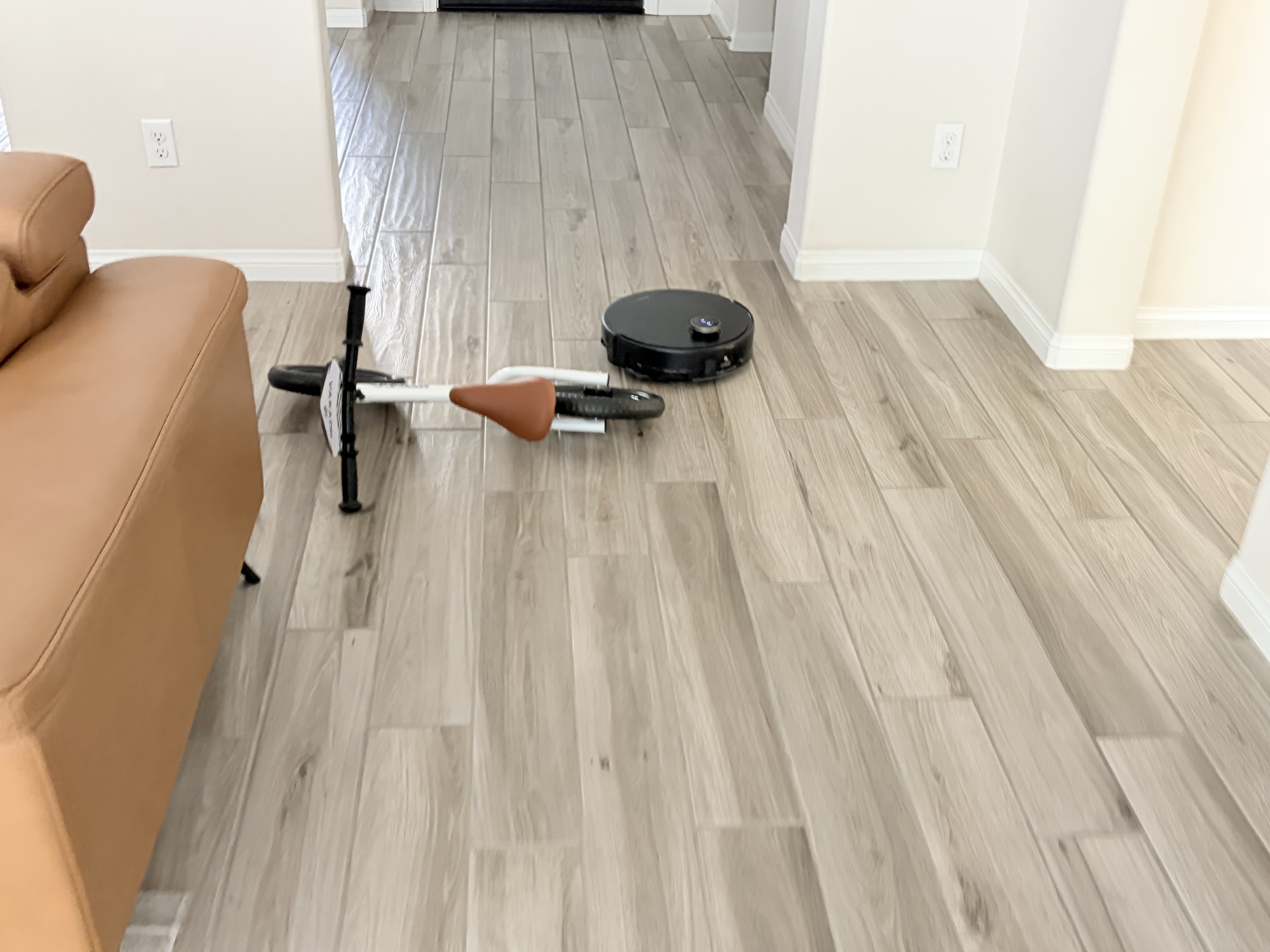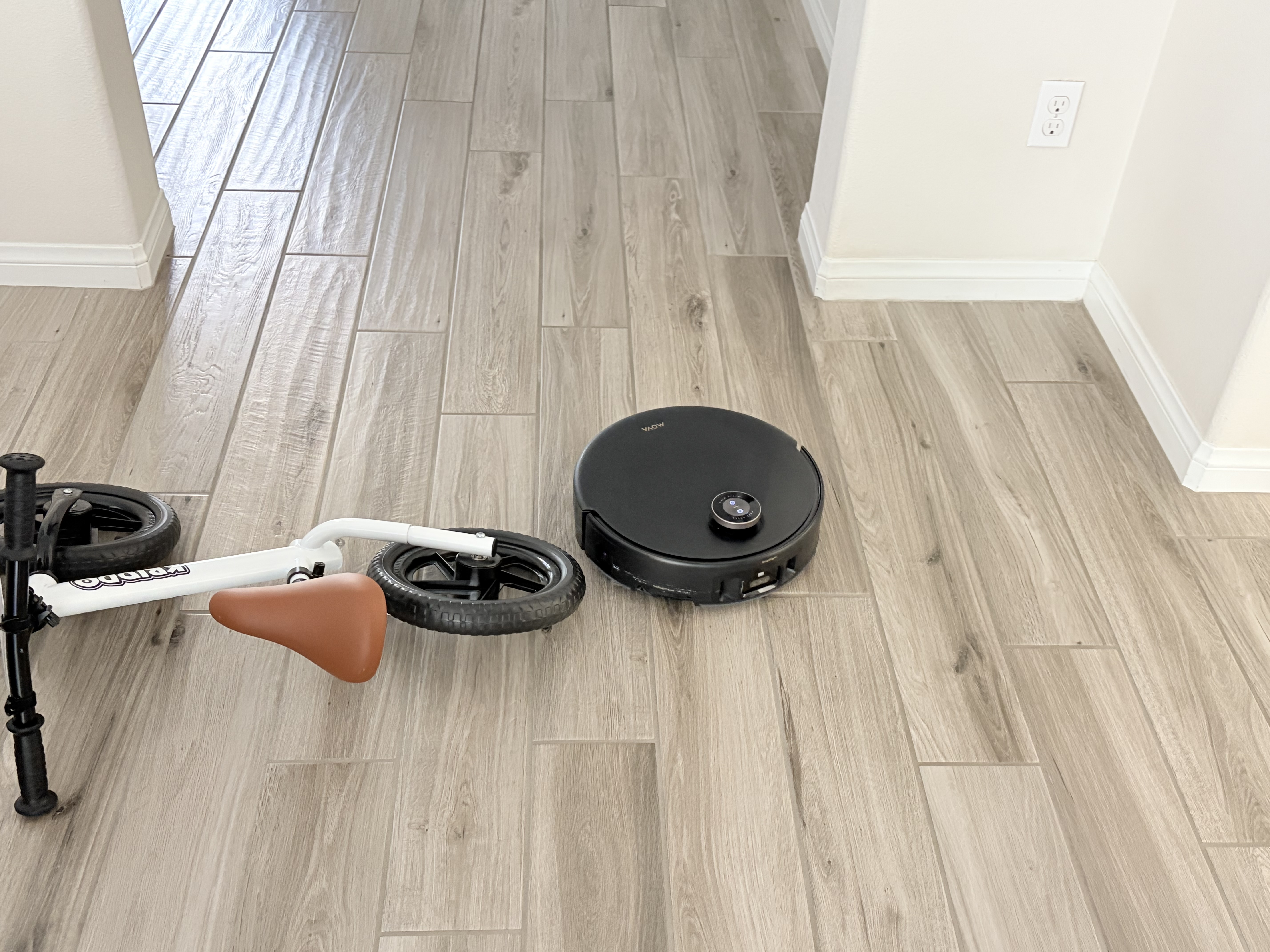 I selected a Zone Cleanup in the app to target the "disaster area" in the hallway. I was honestly so impressed with the navigation—it expertly hurdled right over a pair of slippers and steered around a bike that were in its path without missing a beat or getting tangled up! 🚲🩴