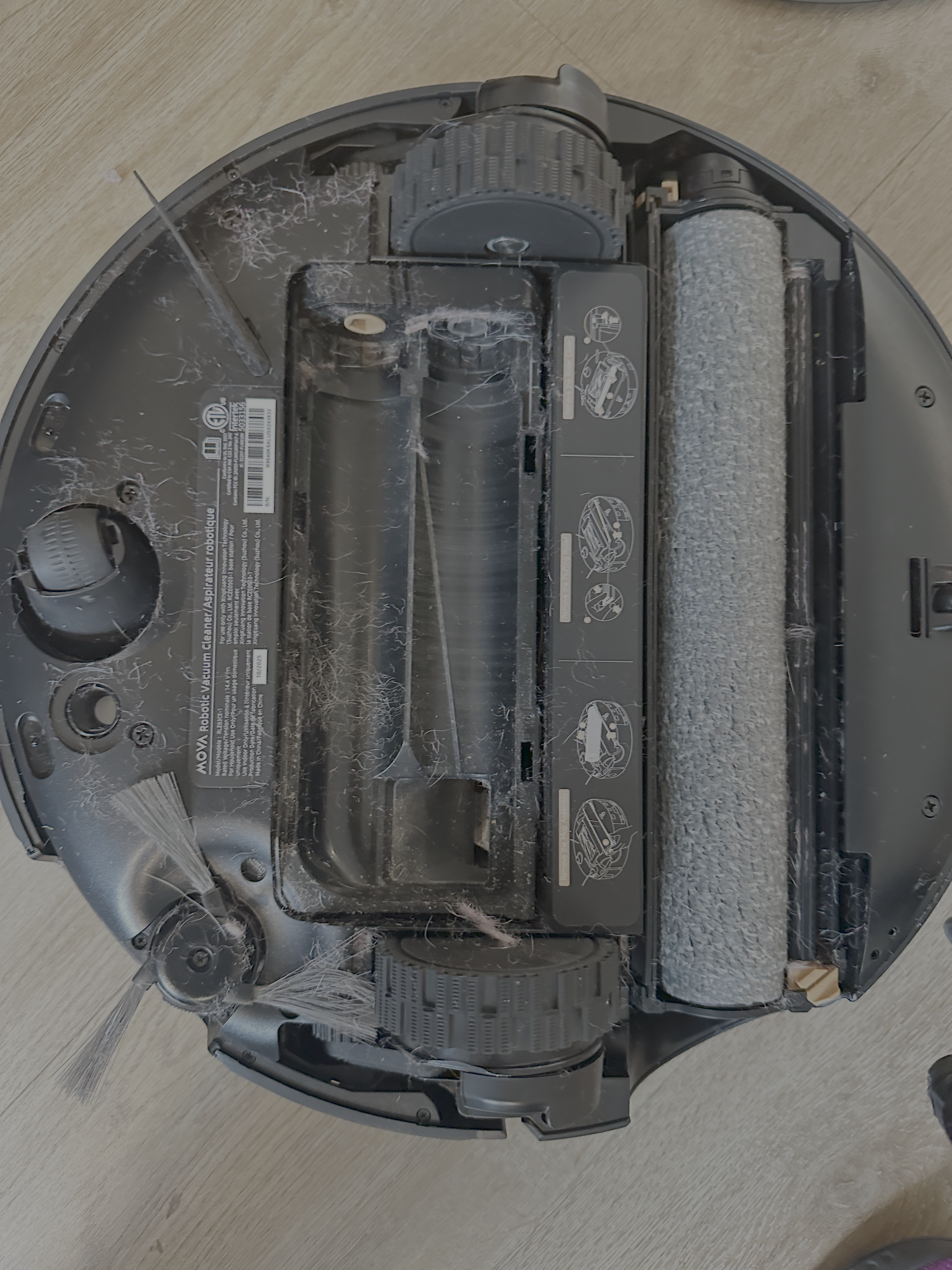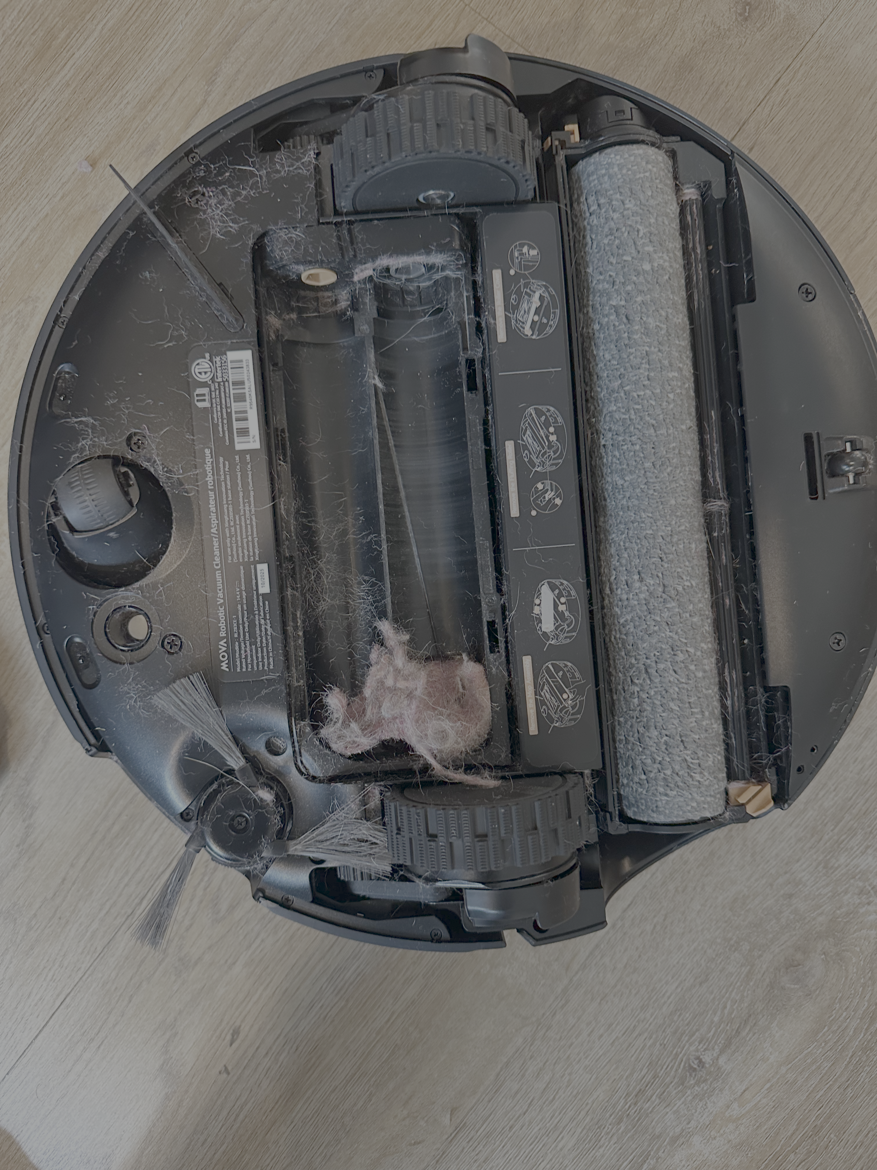 I noticed the Z60's vacuum performance had been dropping off over the past week or so. Floors weren't as clean, the rug was collecting visible debris between runs. So I flipped the robot over to investigate.