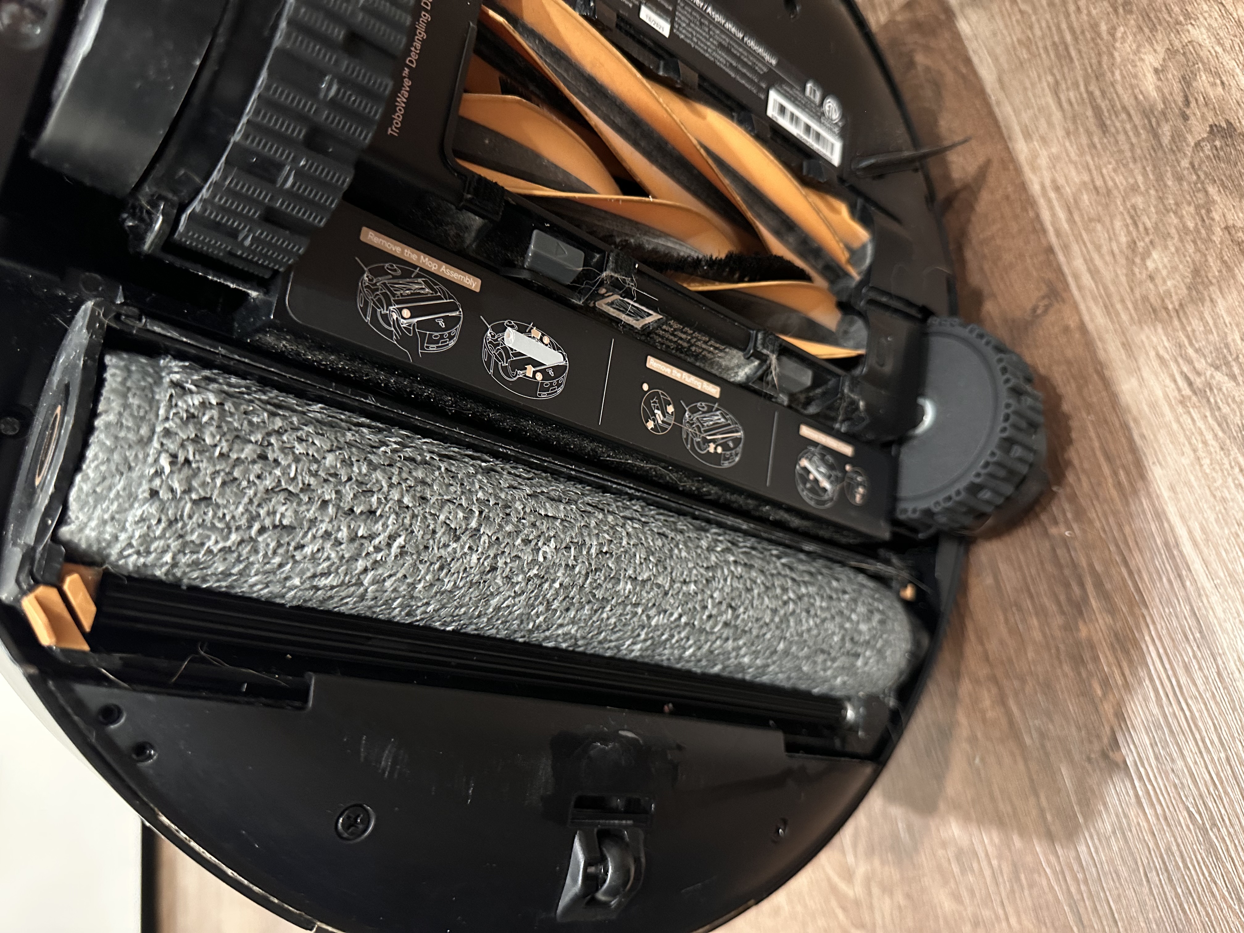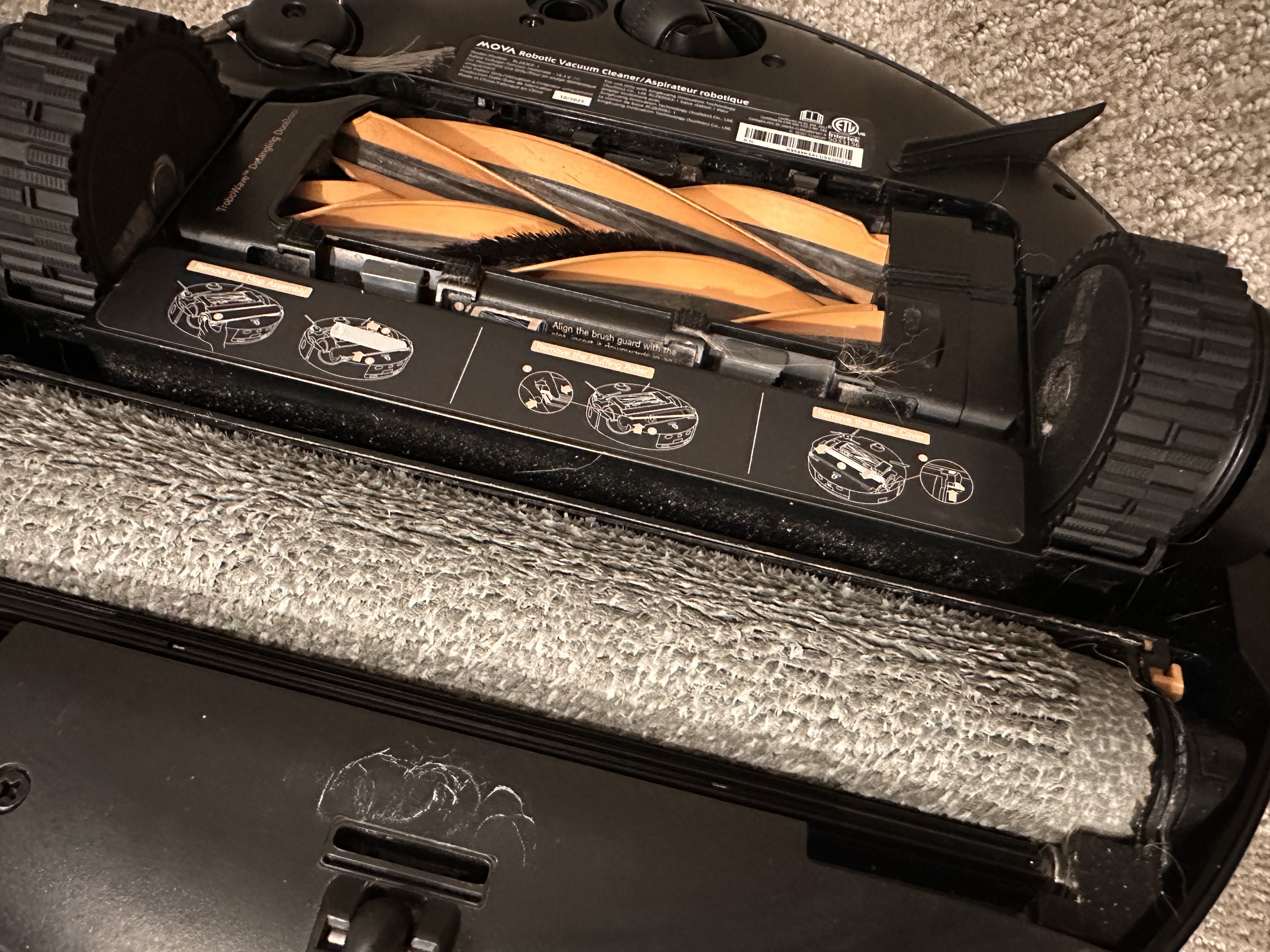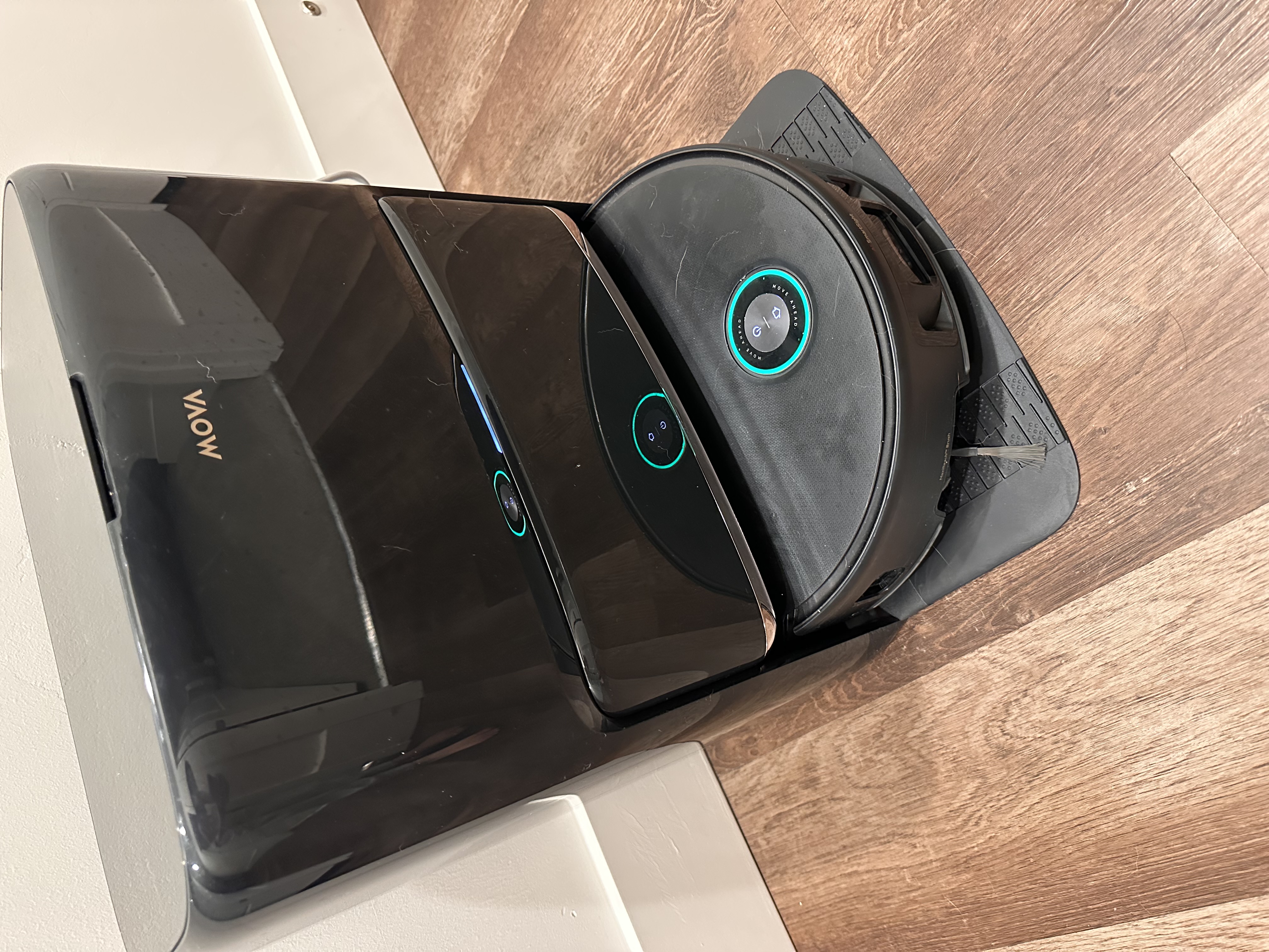 The MOVA Z60 uses a roller mop system that continuously cleans itself while mopping, which helps keep the cleaning consistent throughout the entire run. Even after a full day when my floors were pretty dirty, the before and after didn’t look drastically different because the mop is constantly being refreshed instead of spreading dirty water around. This also makes cleaning faster overall since it doesn’t need to return to the dock as often to wash the mop pads like I had my p10 doing after each room. Instead, it handles that process while actively cleaning. The photos show the before, after, and what the vacuum looks like during the mop pad cleaning process.
