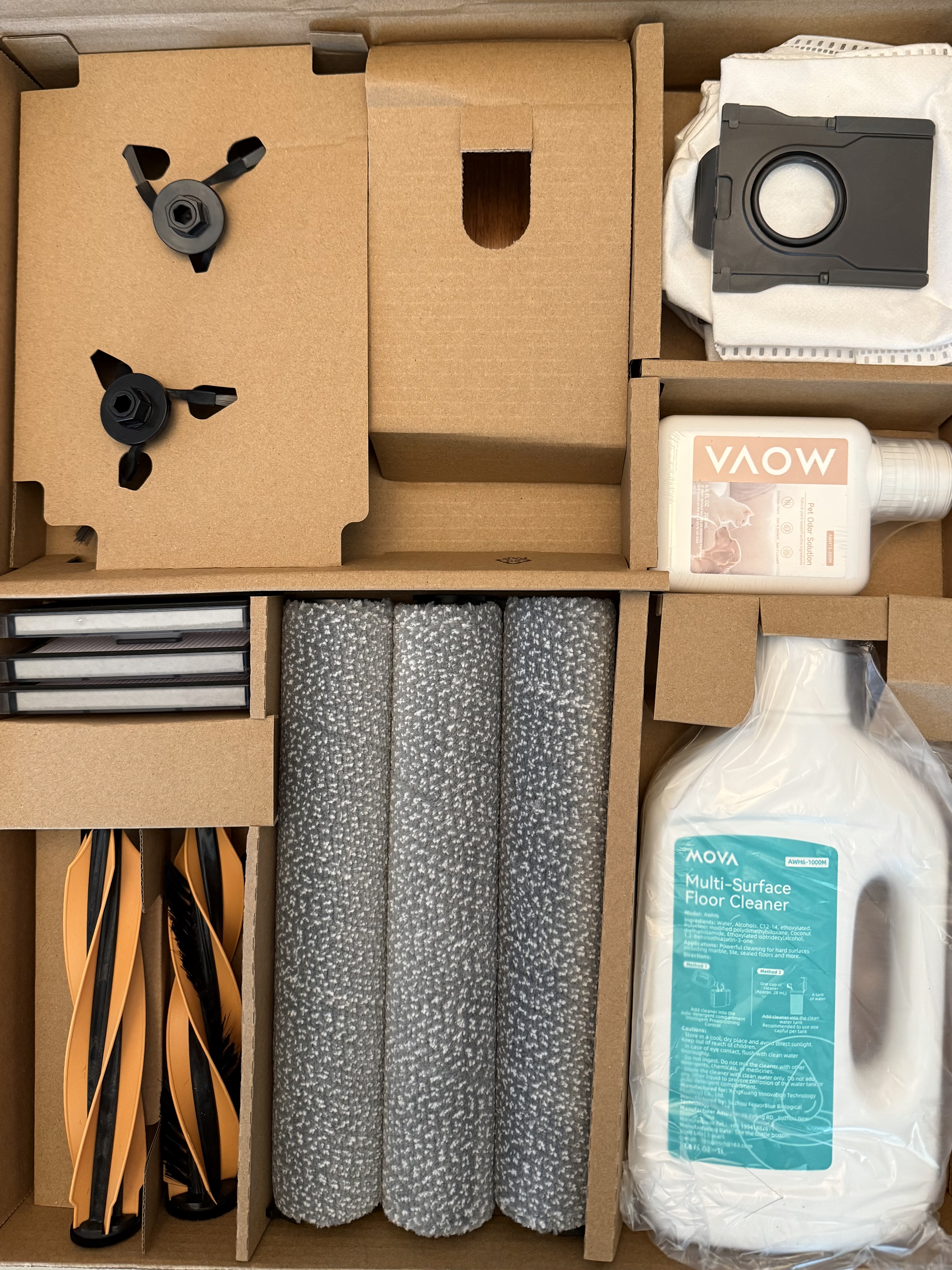 Inside the box - Mova doesn't disappoint.  Mova includes a complete accessory pack to ensure success and no need to re-order supplies immediately.  The accessory pack includes 3 dust bags, 2 front brushes, 3 filters, 2 orange/black brushes, 3 roller mops, a full bottle of the floor cleaner and bottle of the pet detergent.  The same items were preinstalled in the unit (except the cleaner) so this will give you months of use before you need to re-order.