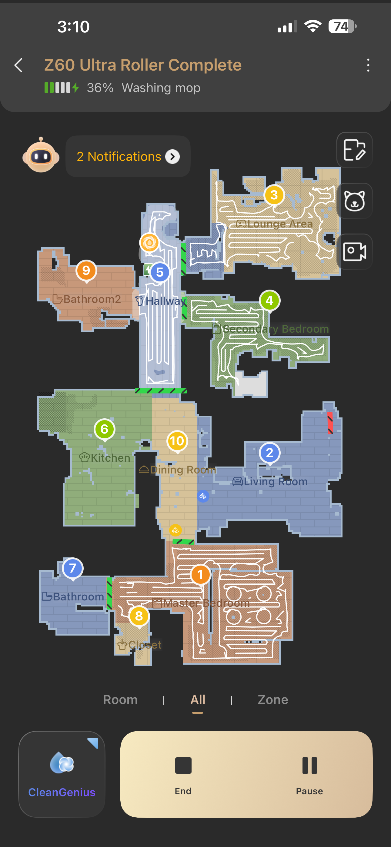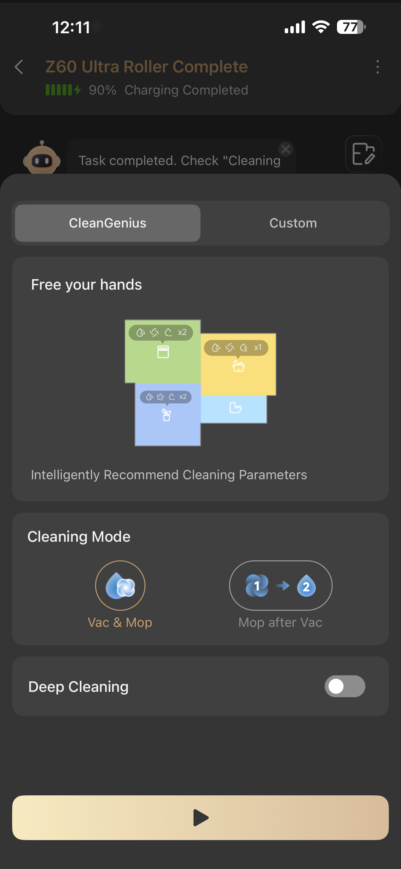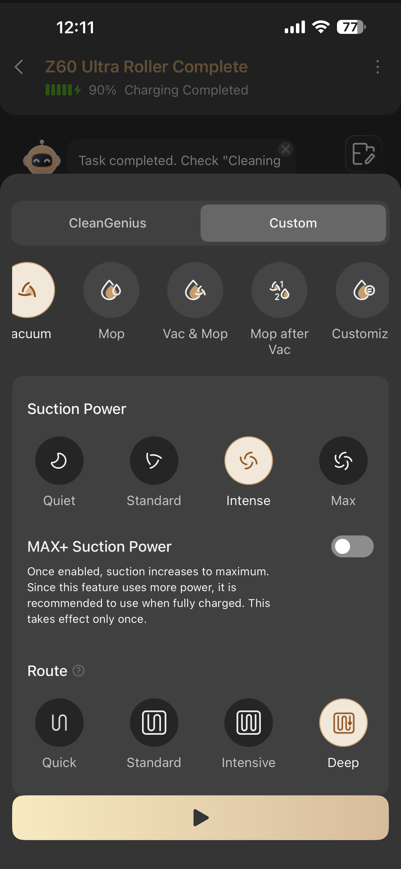 One thing I’ve really enjoyed while testing the MOVA Z60 is exploring the app controls. The home screen shows a live map of the house and even plays a small animation showing what the robot is currently doing, which is fun and helpful to watch. The Clean Genius settings allow options like vacuum then mop, mop and vacuum, and a deep cleaning mode. I also like the custom settings where you can choose the cleaning route such as quick, regular, intensive, or deep. The suction modes are adjustable too, and I especially like quiet mode for nighttime cleaning so I can reset the house before morning without disturbing anyone. You can also choose vacuum only, mop only, or vacuum and mop together, and even set how many times the robot cleans a room like vacuum twice then mop, or deep vacuum followed by deep mop.