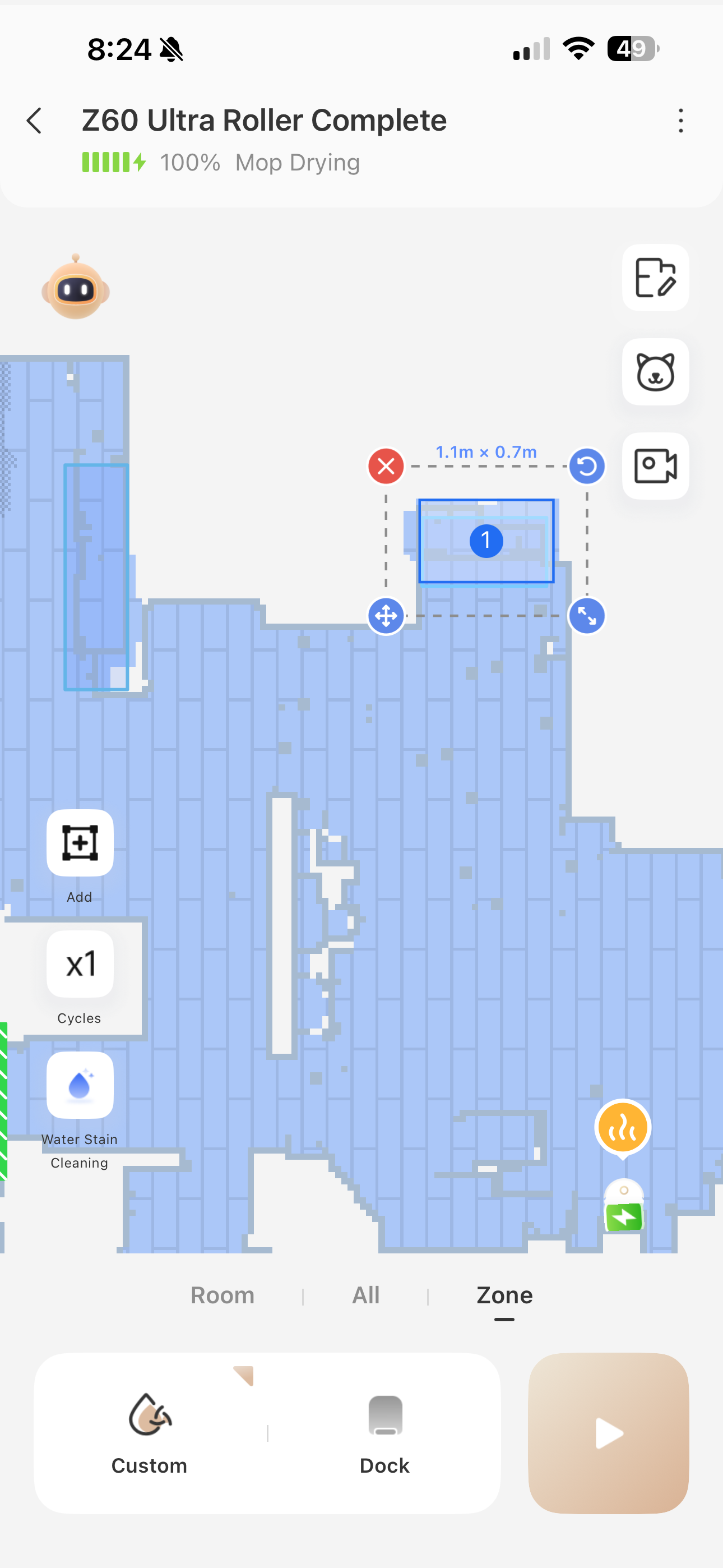 If I want to be a little more precise, I’ll use the zoned cleaning and draw a box exactly where I know there’s a mess. It’s really easy to resize and takes just a few seconds. I’ve been doing this a lot lately since my one year old is in a phase where he wants to chase the vacuum, so instead of running full schedules, I’ve been more hands-on with where and when it cleans.