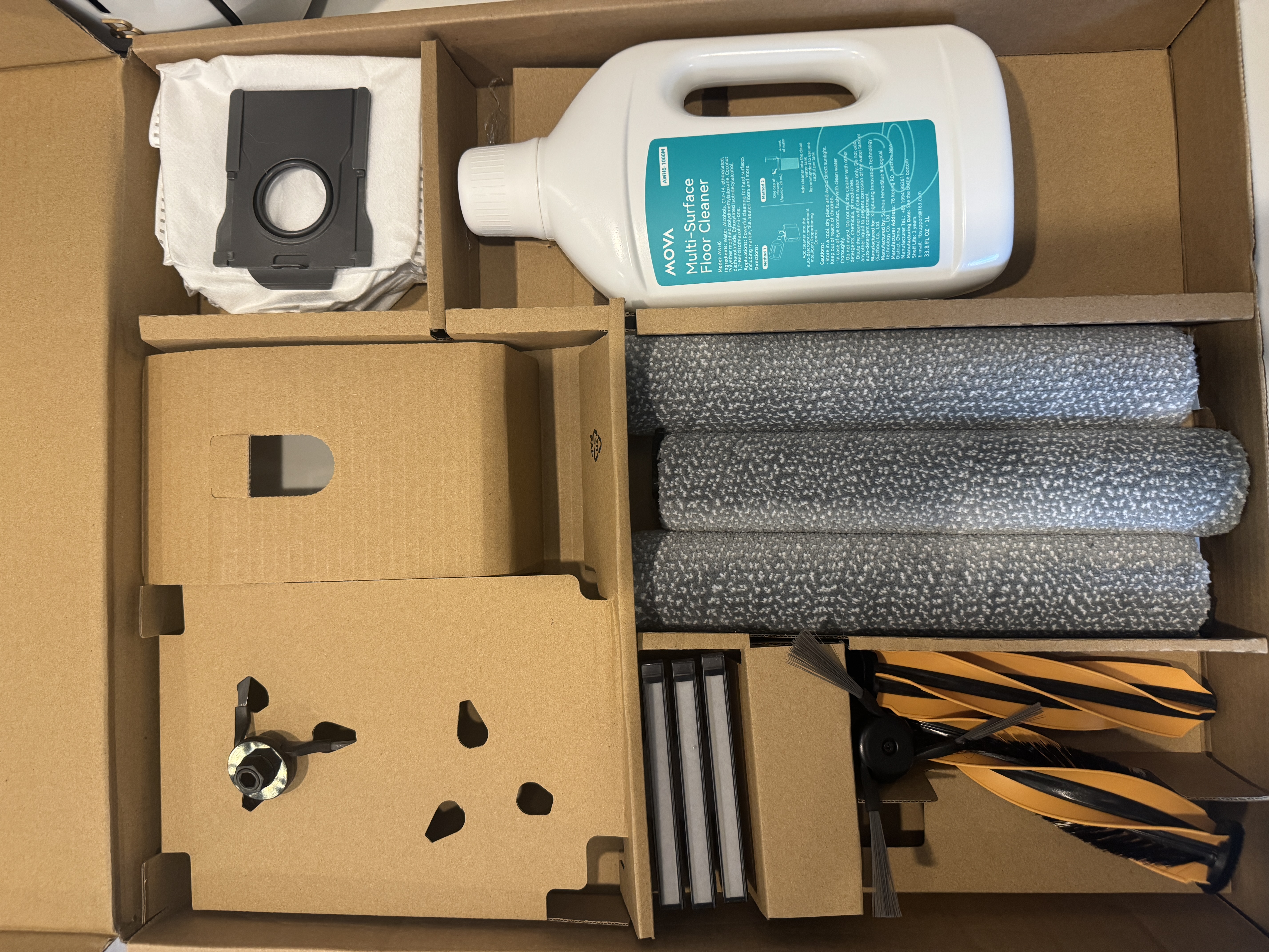 One thing I really appreciate is that MOVA actually includes replacement accessories right out of the box. You get extra mop rollers, vacuum fins, cleaning solution, bags, and side brushes. Realistically that is probably $200 in accessories and that should cover around four to six months of use, which makes maintaining it a lot easier and saves you from immediately having to order more parts.